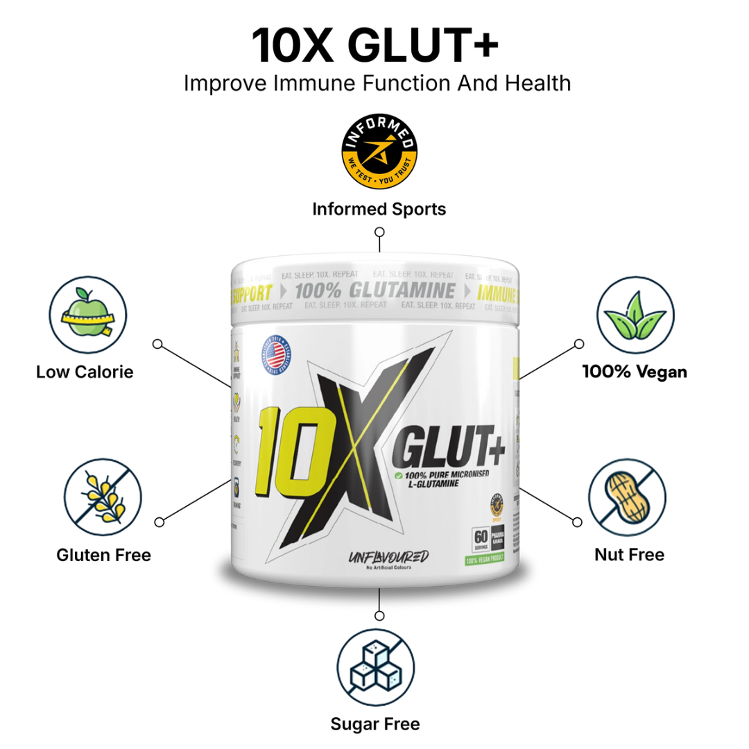 Experience the power of 10X Athletic GLUT+ 300g, designed to support muscle recovery and enhance your workout performance. This premium glutamine supplement helps reduce muscle soreness and promotes faster repair, so you can train harder and bounce back quicker. Perfect for athletes and fitness enthusiasts aiming to maximize their gains and maintain peak condition. Elevate your fitness routine with 10X Athletic GLUT+ and feel the difference in every session.