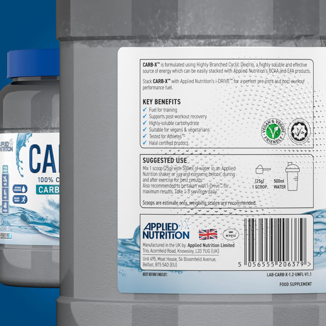 Carb-X™ Highly Branched Cyclic Dextrin carbs (Cluster Dextrin®) are highly soluble and provide a quick source of energy. Carb-X can be used alongside Applied Nutrition’s BCAA and EAA formulas. Another perfect product to take in conjunction with Carb-X is Applied Nutrition’s i-Drive™.