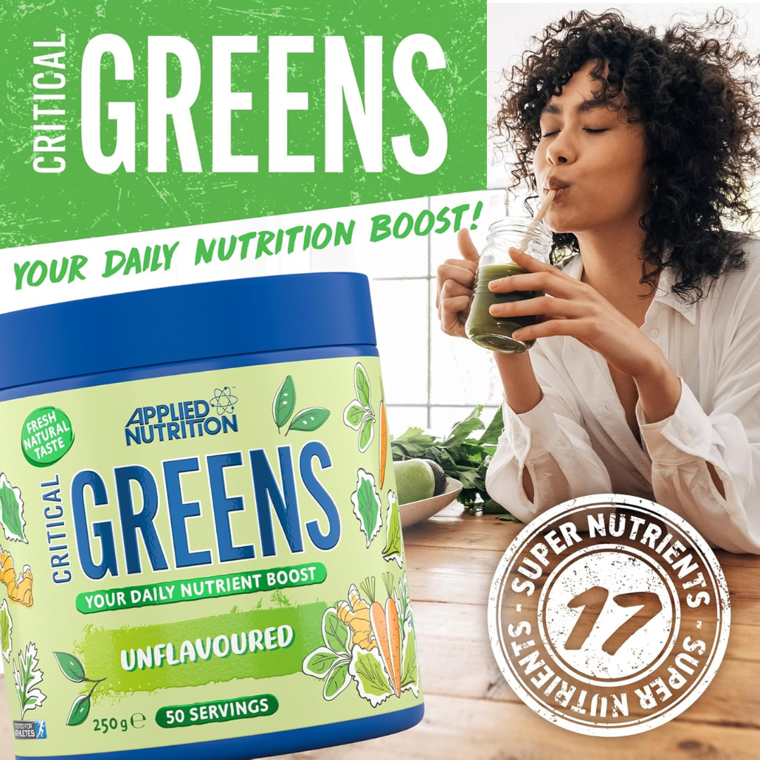 Critical Greens is packed with 17 super-greens extracts including broccoli, celery, spinach, wheatgrass, and kale powder — get your greens in a super-convenient way. Our critical blend can simply be added to your protein shake, fruit smoothie or can be mixed with water for a fresh natural taste.