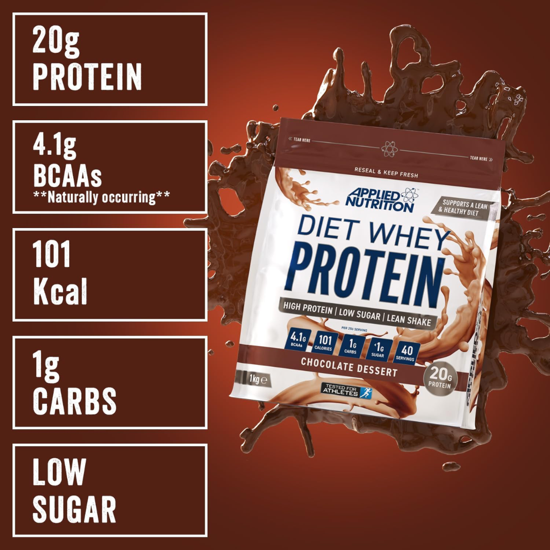 HIGH PROTEIN | LOW SUGAR | LEAN SHAKE Applied Nutrition's Diet Whey Protein with CLA, Acetyl L-Carnitine, and Green Tea Extract is a comprehensive supplement designed to aid in weight management, muscle maintenance, and overall health. Its unique blend of ingredients ensures you get the necessary nutrients to support your fitness journey while enjoying great taste and convenience.