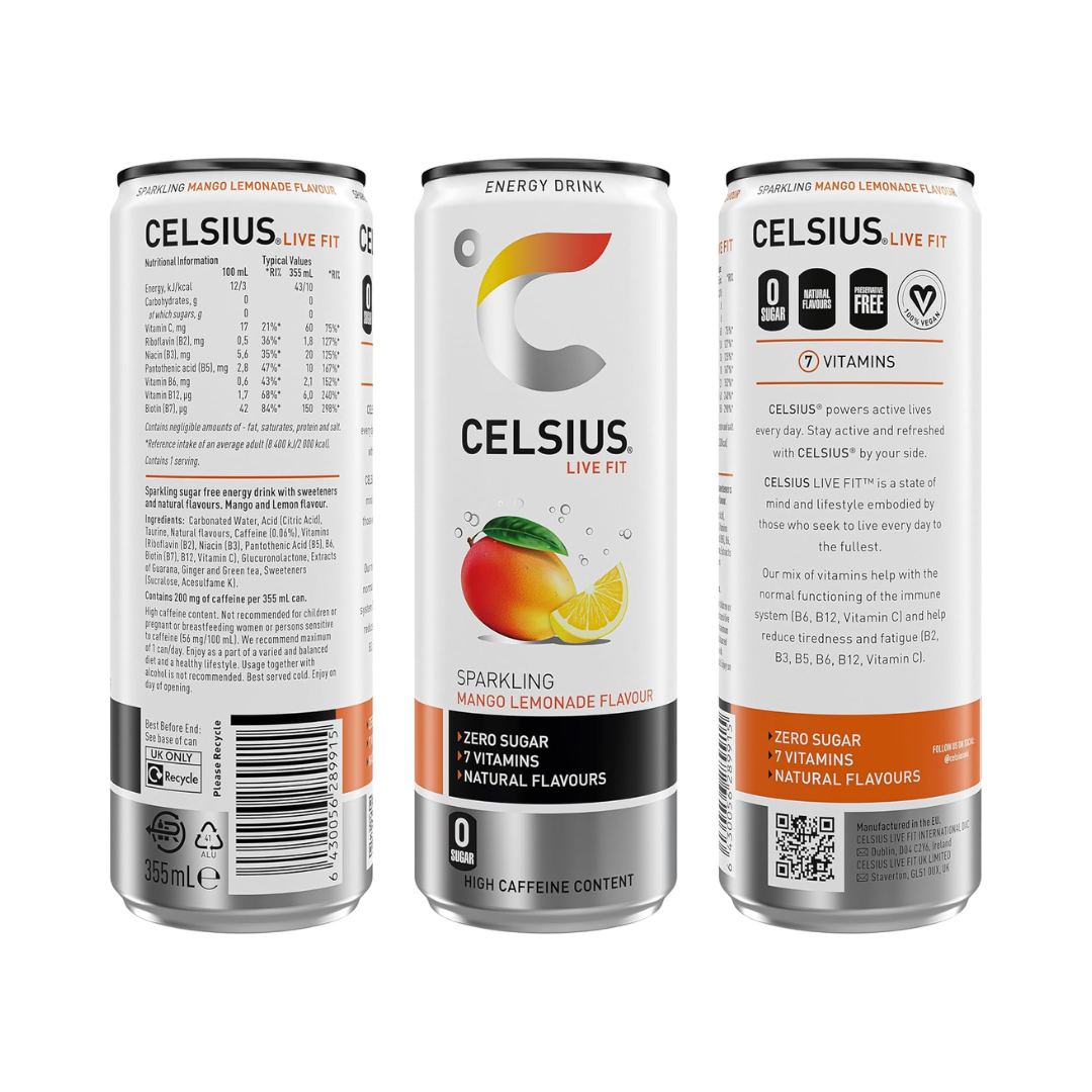 Celsius Energy Drink delivers a potent blend of metabolism-supporting ingredients in a refreshing Mango Lemonade flavour. Each 355ml can contains essential amino acids, vitamins, and natural caffeine to fuel intense workouts and sustained energy throughout the day. With zero sugar and minimal calories, this 12-pack provides convenient pre-workout nutrition without compromising your dietary goals. Ideal for athletes and fitness enthusiasts seeking performance enhancement and thermogenic support.