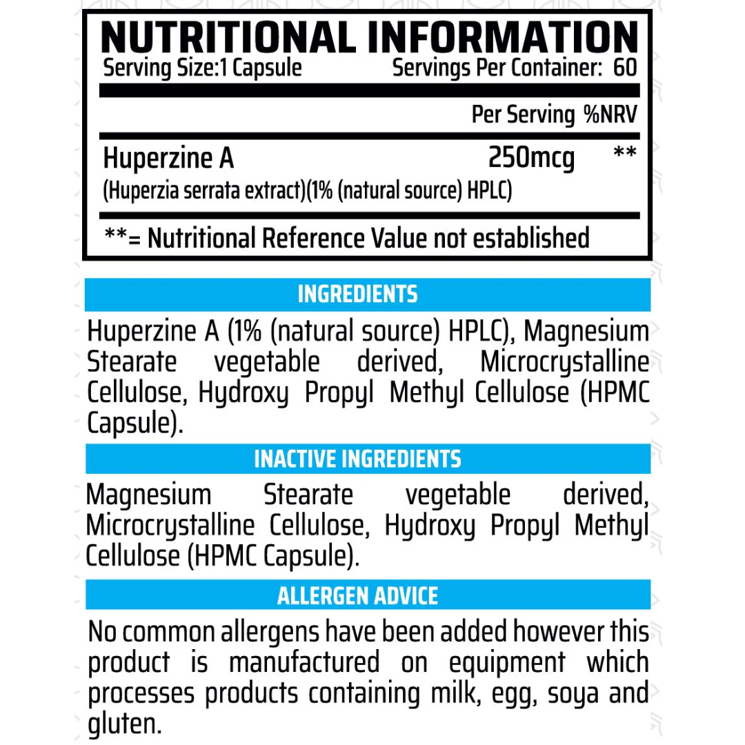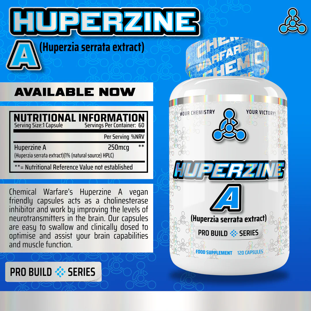Chemical Warfare's Huperzine A vegan friendly capsules acts as a cholinesterase inhibitor and work by improving the levels of neurotransmitters in the brain. Our capsules are easy to swallow and clinically dosed to optimise and assist your brain capabilities and muscle function.