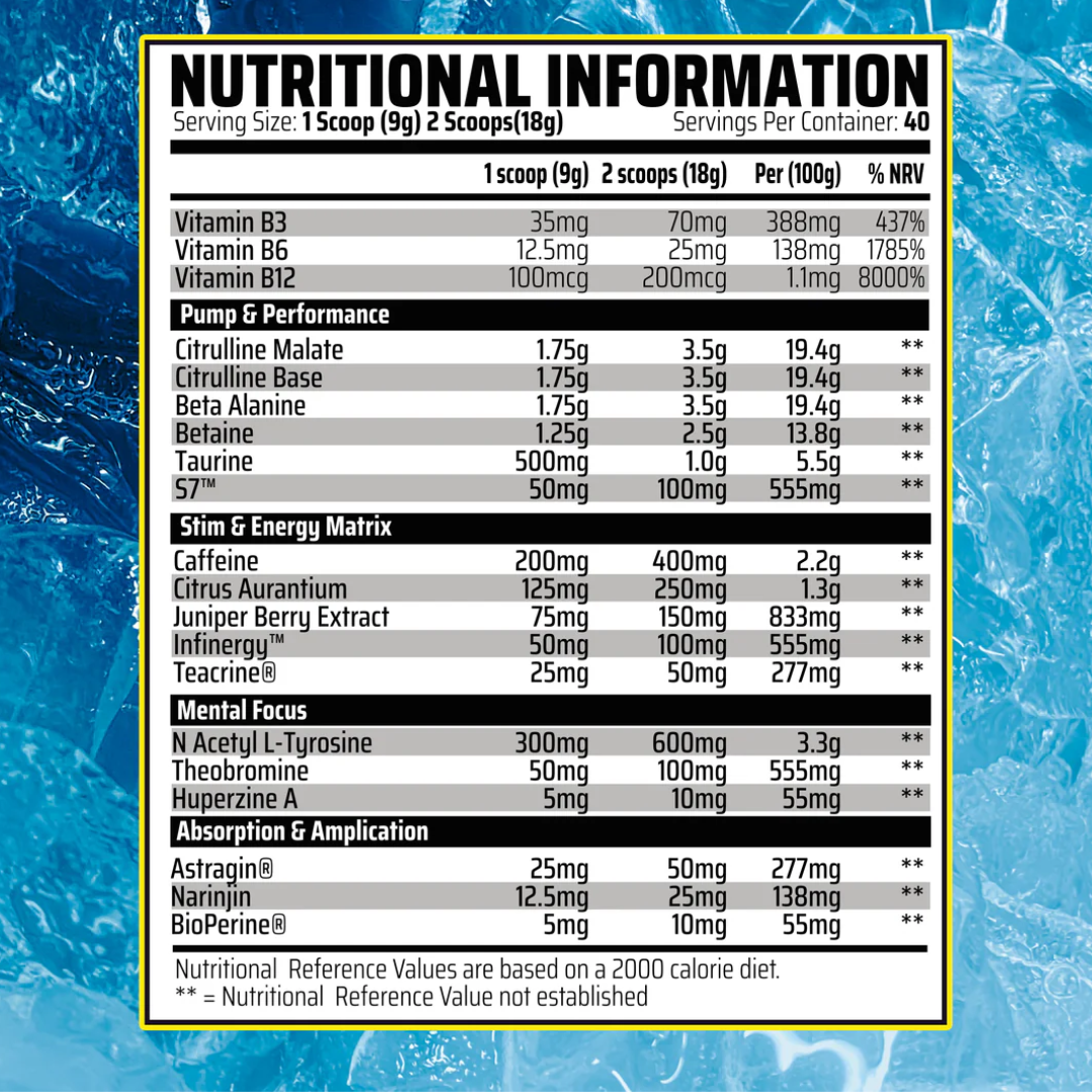 Pump and Performance: We've supercharged the formula with a whopping 7g of Citrulline Malate and 3.5g of Beta Alanine, providing you with insane pumps and endurance to crush your workouts. But we didn't stop there—we've also added Betaine and the cutting-edge, clinically tested ingredient S7® at a potent 100mg dose to support your performance.