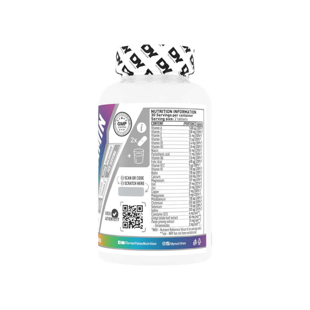 DY Nutrition's comprehensive multivitamin formula delivers essential vitamins and minerals in convenient tablet form. Each bottle contains 60 tabs designed to support daily nutritional gaps and promote overall wellness. This formula helps maintain energy levels, support immune function, and contribute to optimal health when combined with a balanced diet. Ideal for those seeking a straightforward, effective way to supplement their nutrition. Take as directed on the packaging for best results.