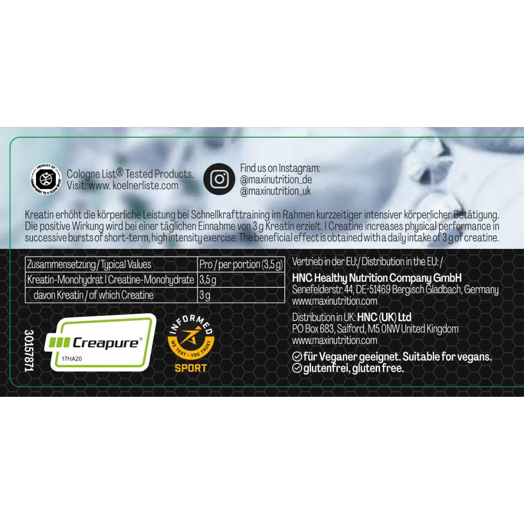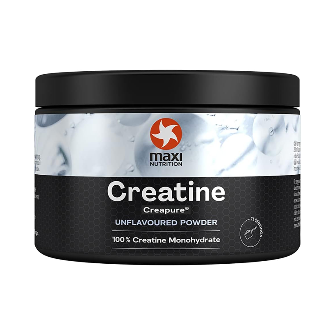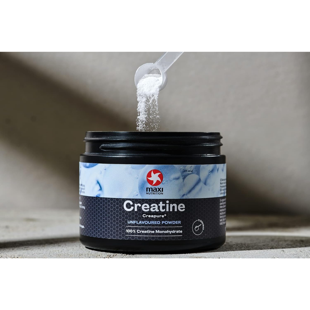 MaxiNutrition Creapure comes in a 250g black tub, with a serving scoop for ease of use. There are 71 (3.5g) servings in each tub. Traditionally, Creatine supplementation would start with a loading phase of 20g (0.3g of creatine per kg of body weight) a day for 3-5 days, followed by a maintenance phase of 3-5g a day for up to 6 months. A single tub would last for approximately 4-6 weeks, perfect to see results and support a training phase of 6-12 weeks.