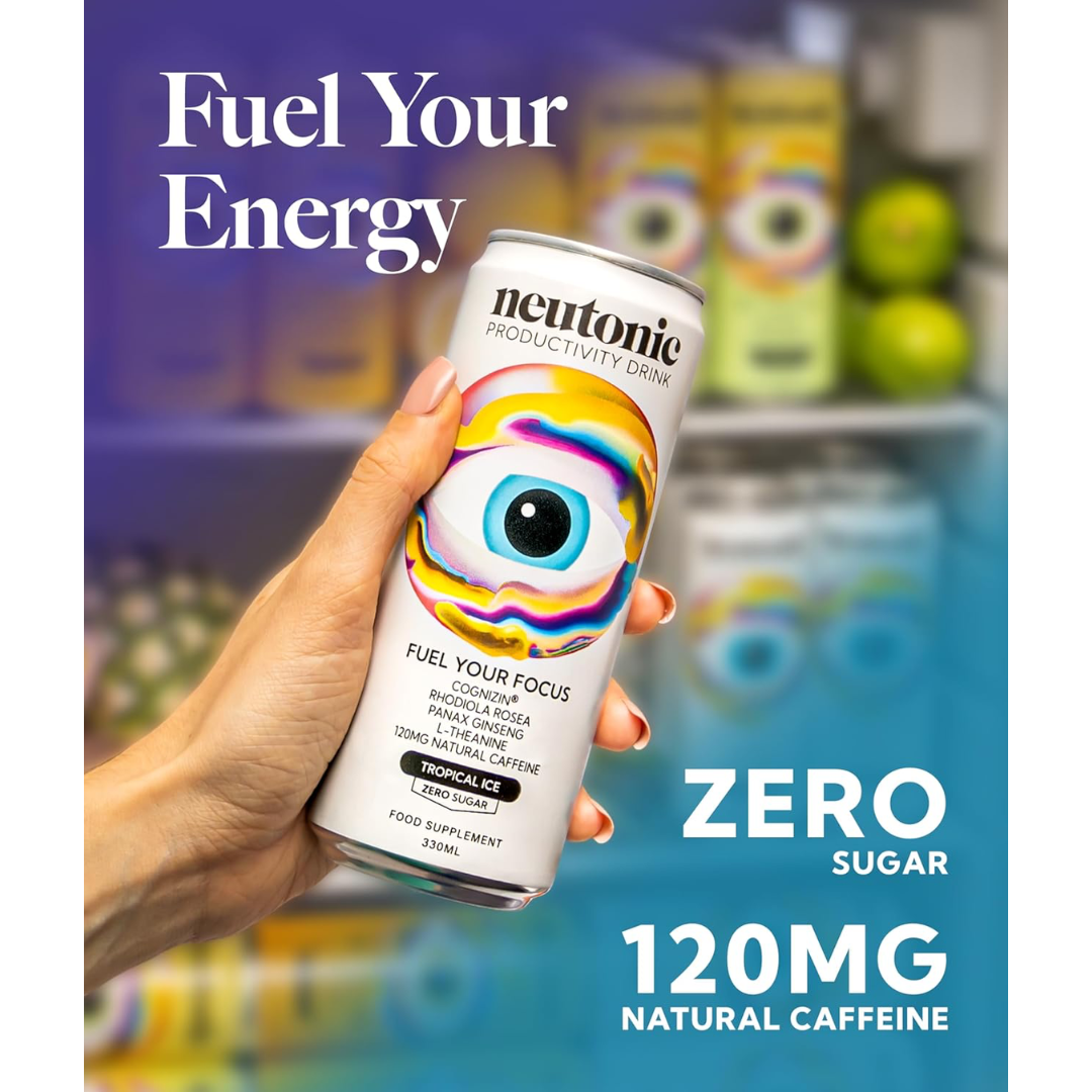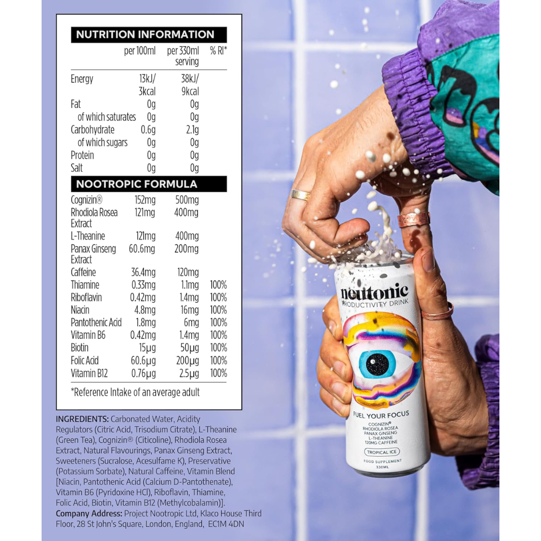 Neutonic Tropical Ice 12x330ml is a refreshing nootropic energy drink designed to boost focus, enhance performance and keep you feeling sharp throughout the day. Bursting with a cool tropical fruit flavour and an icy finish, this 12-pack delivers clean, sustained energy without the crash of standard energy drinks, making it the perfect smarter choice for study, work or training.