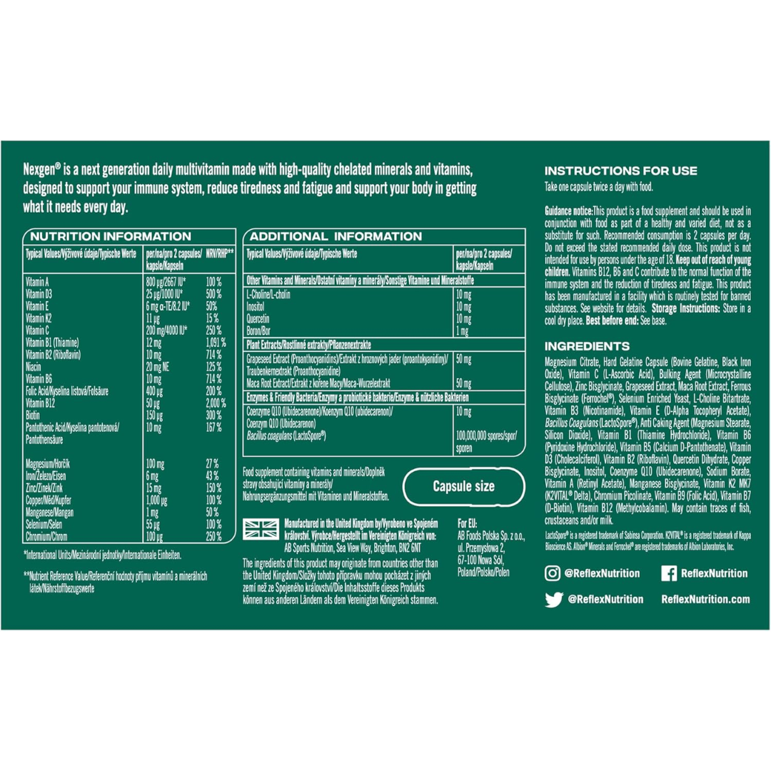 Reflex Nutrition Nexgen 60 Caps is a high-quality multivitamin supplement formulated to support overall health and wellness. Packed with essential vitamins and minerals, this product helps to fill any nutritional gaps in your diet, ensuring that your body has the necessary nutrients to perform at its best. Nexgen includes a powerful combination of antioxidants, vitamins, and minerals to support immune function, energy production, and cognitive health. With 60 capsules per bottle, it's a convenient way to promote general health and well-being, especially for active individuals who may require additional nutrients to support their active lifestyle.