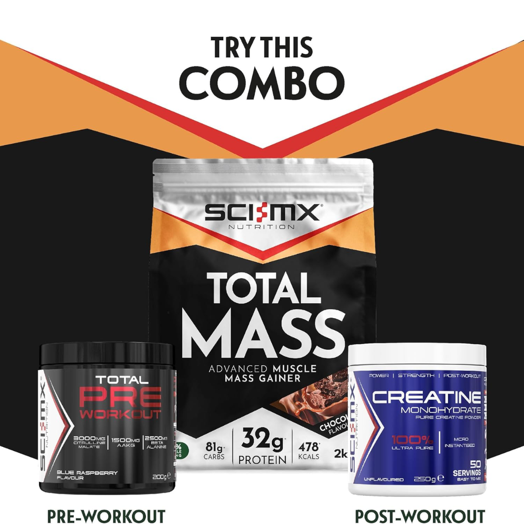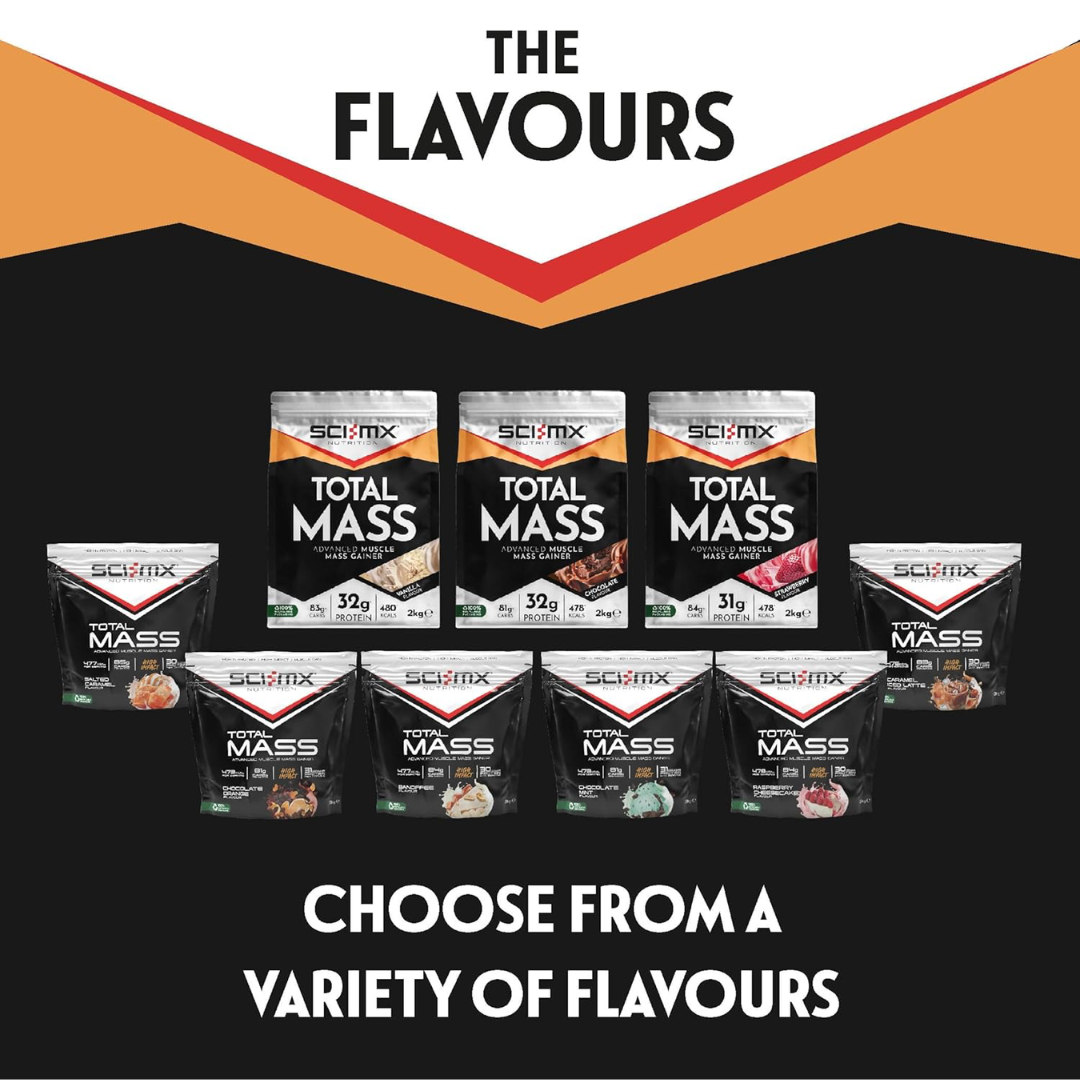 Sci-MX Total Mass is a comprehensive weight gain formula engineered to support muscle development and strength gains. Each serving delivers a balanced blend of fast and slow-digesting proteins, complex carbohydrates, and essential micronutrients to fuel intense training and recovery. The rich chocolate flavour makes it an enjoyable addition to your nutrition plan. Ideal for athletes seeking substantial caloric intake to support progressive overload and lean mass accumulation during dedicated training phases.