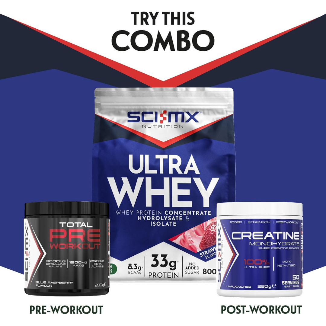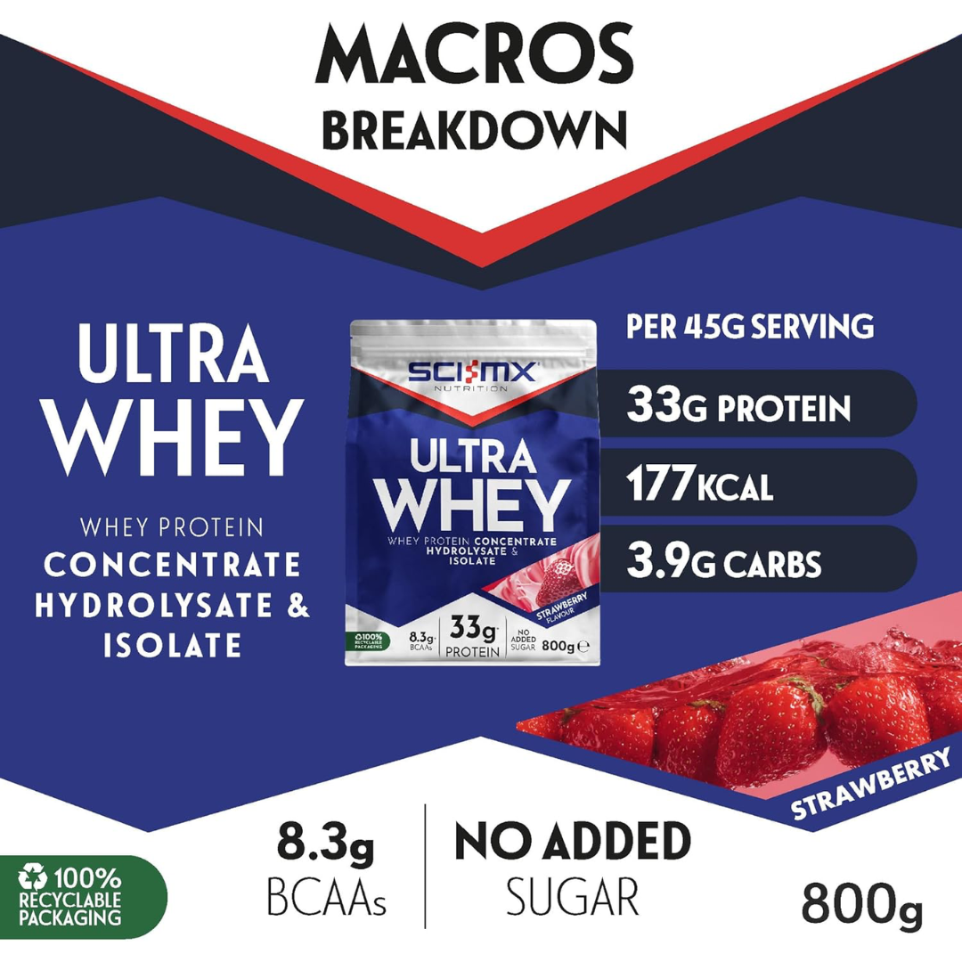 Sci-MX Ultra Whey delivers rapid protein absorption with a blend of whey concentrate and isolate, ideal for post-workout recovery and muscle development. Each serving provides essential amino acids including BCAAs to support lean muscle growth and reduce recovery time. The strawberry flavour mixes smoothly into shakes, smoothie bowls, or baked goods. With 800g per container, this high-quality whey protein offers excellent value for serious athletes and fitness enthusiasts seeking consistent results.
