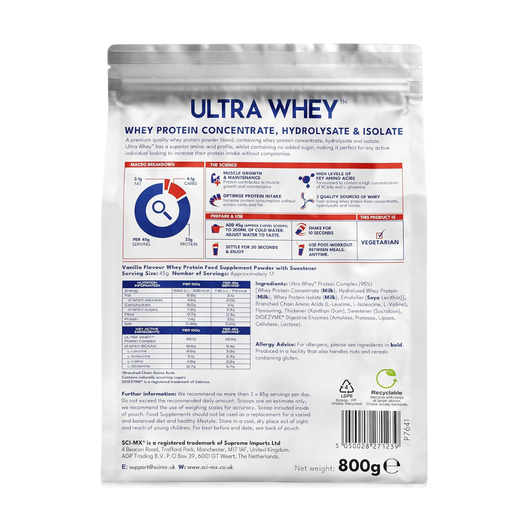 Sci-MX Ultra Whey delivers rapid protein absorption with a blend of whey concentrate and isolate, ideal for post-workout recovery and muscle development. Each serving provides essential amino acids including BCAAs to support lean muscle growth and repair. The smooth vanilla flavour mixes easily with water or milk, making it convenient for daily supplementation. With 800g per container, you'll have consistent nutrition to complement your training programme. Perfect for athletes and fitness enthusiasts seeking reliable protein support.