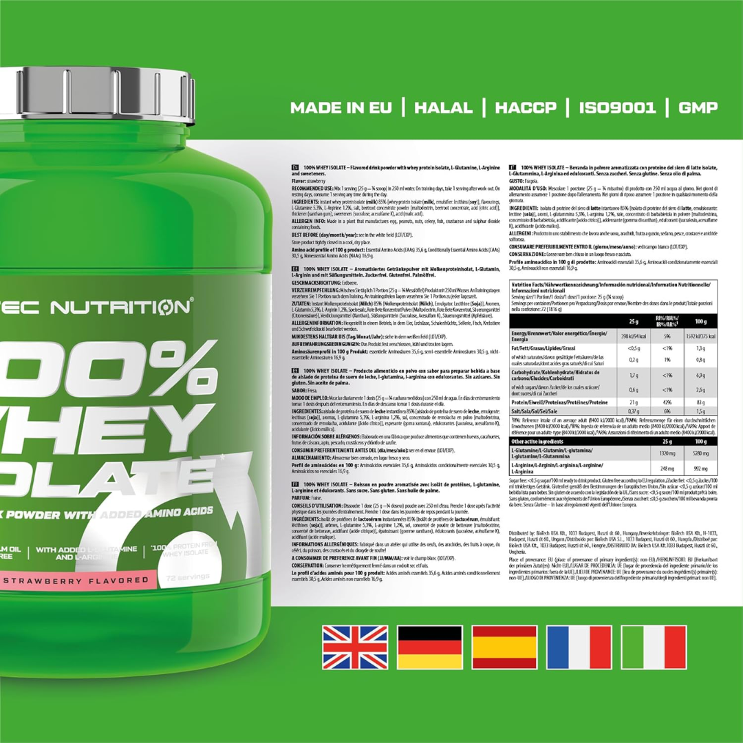 Scitec Nutrition's 100% Whey Isolate delivers a premium protein source with an impressive amino acid profile. This strawberry-flavoured formula provides rapid absorption and minimal lactose, making it ideal for post-workout recovery and muscle development. Each serving supports lean muscle growth whilst maintaining low carbohydrate and fat content. The 1816g container offers excellent value for serious athletes and fitness enthusiasts seeking high-quality whey protein supplementation.