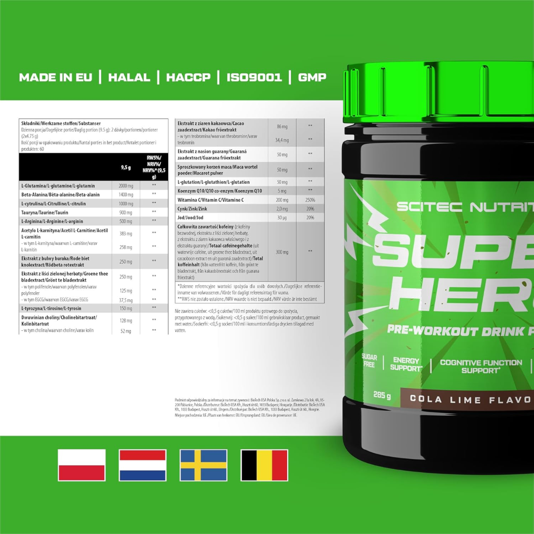 Scitec Nutrition Superhero delivers a refreshing Cola Lime flavour in a convenient 285g serving size. This pre-workout formula is engineered to support energy, focus, and performance during intense training sessions. Packed with scientifically-researched ingredients, Superhero combines stimulants and performance enhancers to help you push harder and recover smarter. The distinctive Cola Lime taste makes every workout more enjoyable. Ideal for athletes and fitness enthusiasts seeking a reliable pre-workout supplement to maximise their training potential.