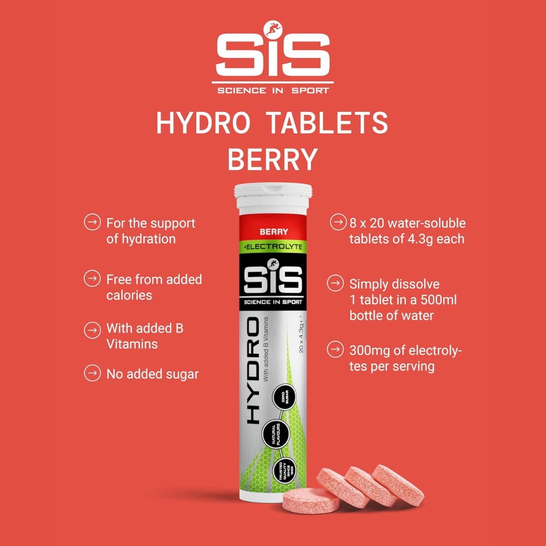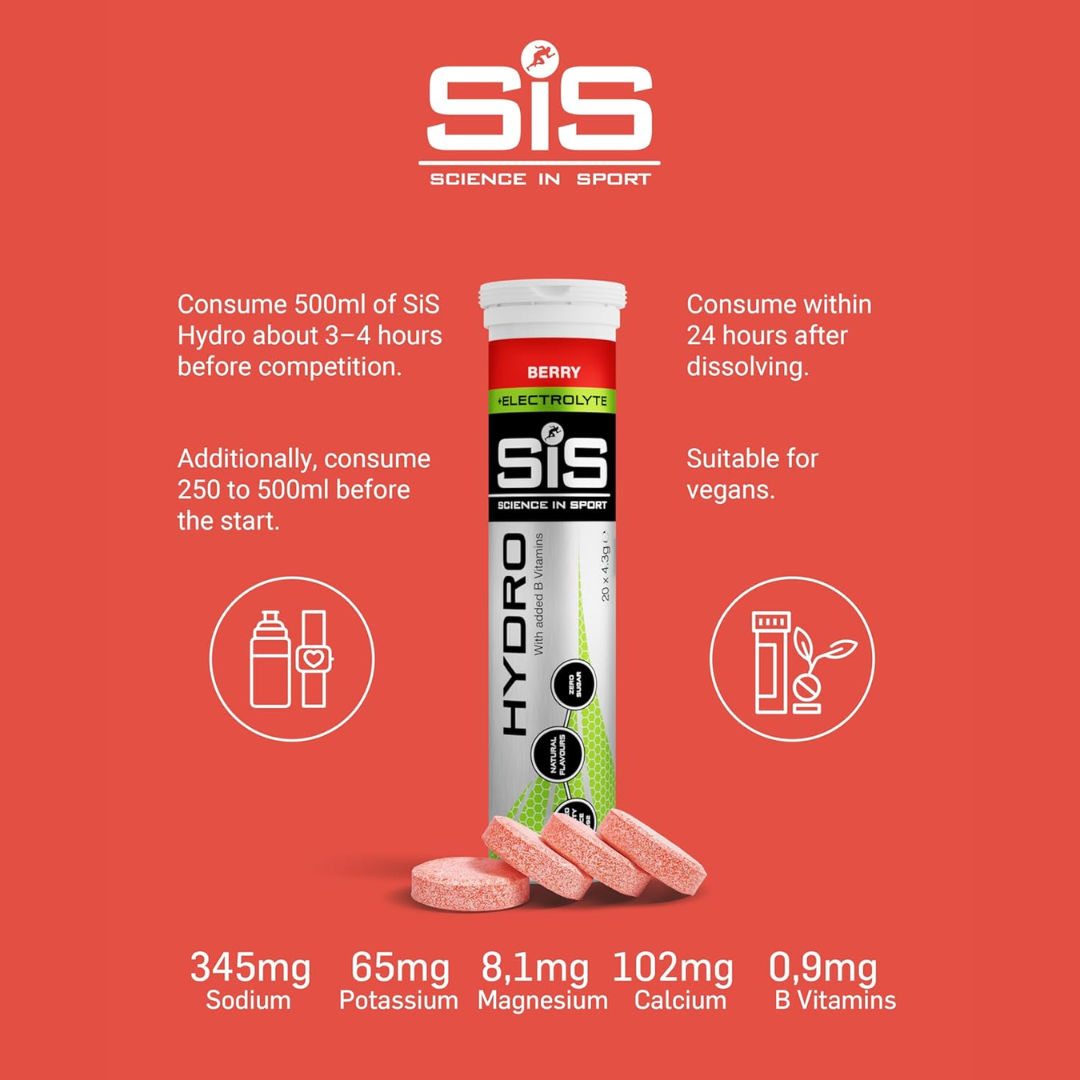 SIS HYDRO delivers rapid electrolyte replenishment in convenient tablet form, designed for athletes requiring quick hydration during intense training or competition. Each berry-flavoured tablet dissolves easily in water, providing a balanced blend of sodium, potassium, and carbohydrates to maintain fluid absorption and sustain performance. The 8x20 tab format offers portability and precise dosing, making it ideal for endurance sports, gym sessions, or outdoor activities. Simply drop a tablet into your water bottle for immediate hydration support without the hassle of powders or heavy bottles.
