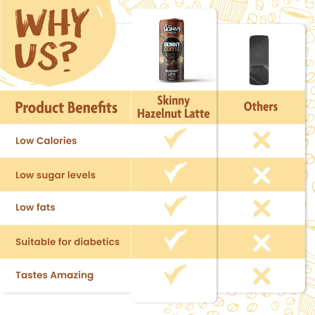 Energize your day with The Skinny Food Co Skinny Coffee Hazelnut Latte. This 12-pack of 250ml serves offers a deliciously smooth coffee infused with rich hazelnut flavor, perfect for a guilt-free pick-me-up. Low in calories yet full of taste, these ready-to-drink lattes are ideal for enjoying anytime you need a refreshing caffeine boost without compromise.