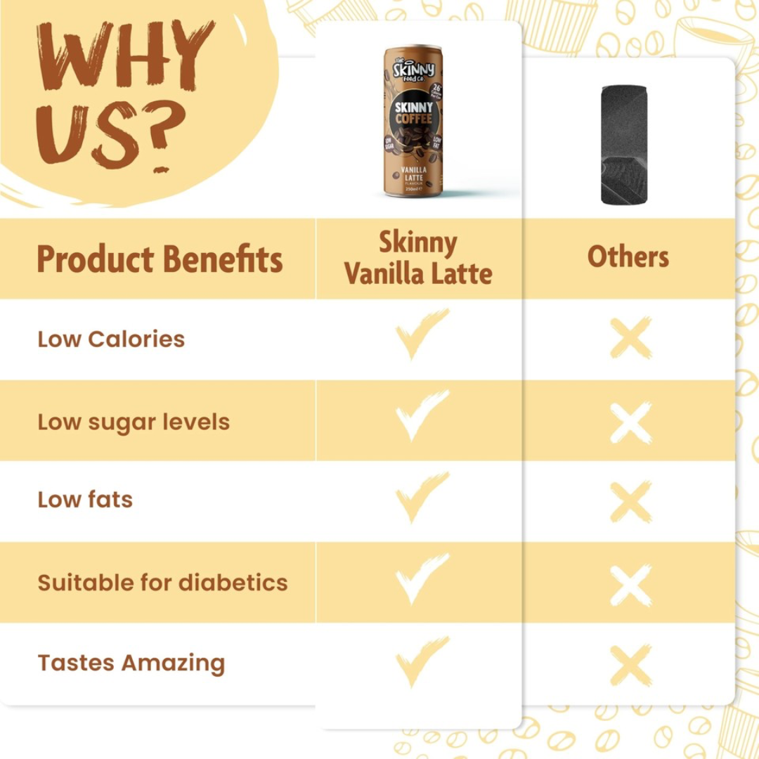 Experience the perfect guilt-free indulgence with The Skinny Food Co Skinny Coffee Vanilla Latte. Each 250ml can delivers a smooth, creamy coffee taste with a hint of vanilla, all while being low in calories. Conveniently packaged in a pack of 12, this ready-to-drink coffee lets you enjoy a delicious latte anytime, helping you stay energized and refreshed without compromising your goals. Ideal for those who want great flavour and convenience in one satisfying drink.