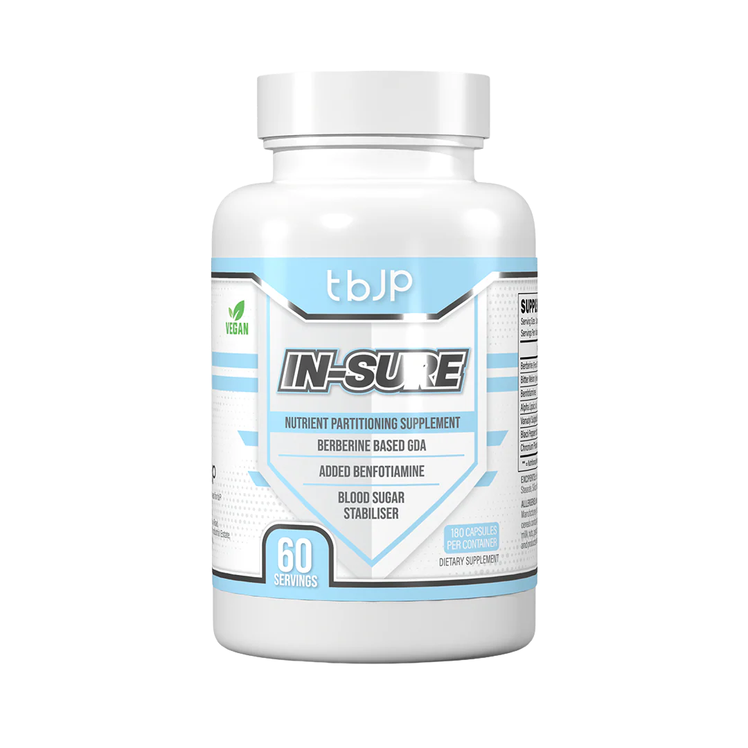 Trained By JP In-Sure 180 Caps is a glucose disposal supplement that supports insulin sensitivity and helps direct carbs into muscles, promoting lean gains and efficient nutrient use during high-carb meals.