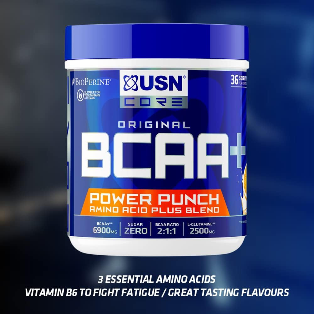 USN BCAA Power Punch is an advanced intra-workout supplement that combines BCAAs with electrolytes and energy-boosting ingredients to keep you performing at your best during training. With 2:1:1 ratio BCAAs, this supplement helps reduce muscle breakdown, delay fatigue, and speed up recovery. The added electrolytes support hydration, keeping you energized and maintaining optimal fluid balance throughout your workout. USN BCAA Power Punch also contains a natural energy blend, providing you with the stamina needed to power through high-intensity training sessions. Available in an easy-to-mix powder form, this supplement is a must-have for athletes and fitness enthusiasts aiming for peak performance.