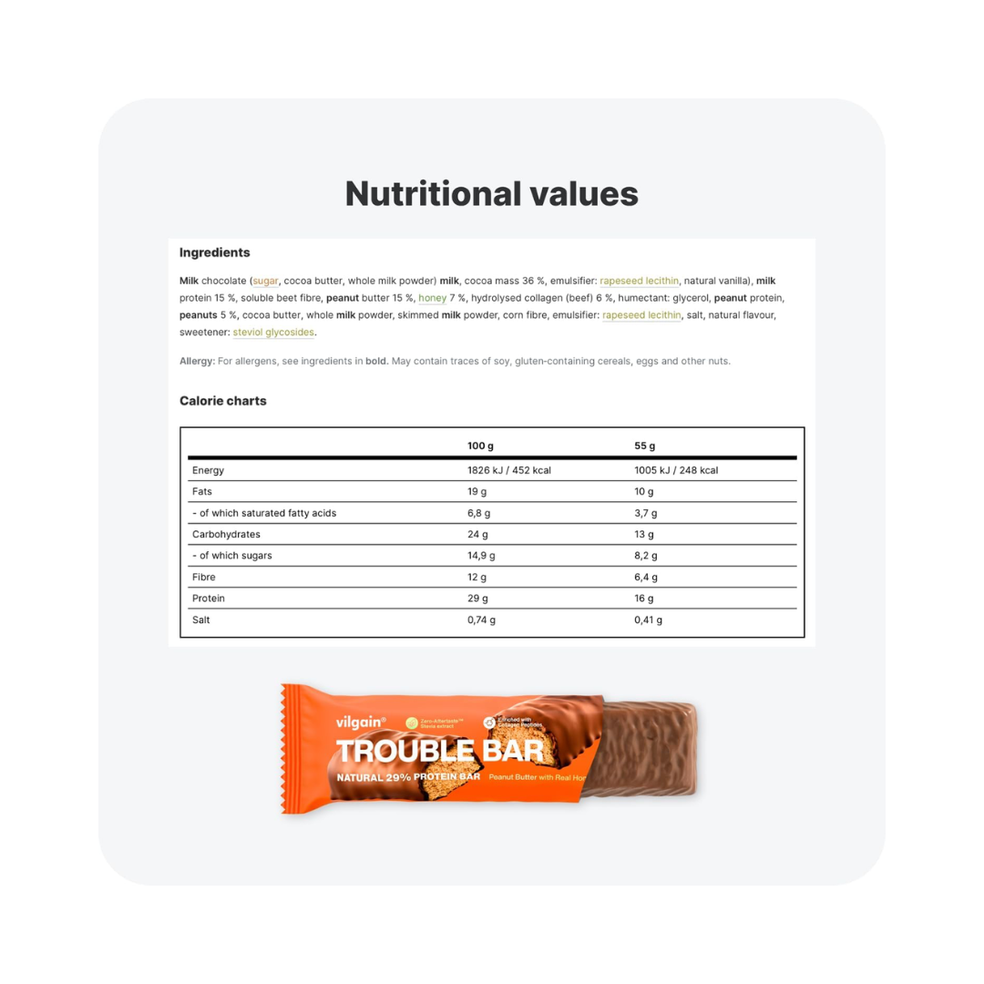 Vilgain Trouble Protein Bar 12x55g Peanut Butter with real honey